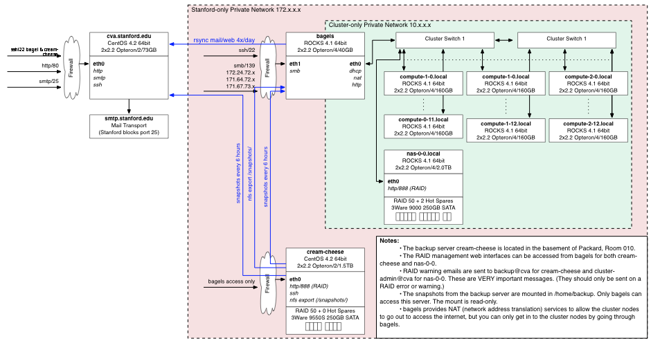 The cluster consists of a head node (bagels), 38 compute notes (compute-0-1 to compute 2-12), and a storage server (nas-0-0). All CVA user accounts are stored and managed on the cluster head node and automatically propagated to the compute nodes. User account storage is on the nas-0-0 cluster file server. The cluster is accessible through the head node, bagels.stanford.edu, but only from on-campus, or via the gates VPN.
